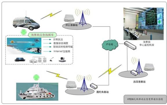 根据建设方需求,采用TDD无线移动应急宽带通信系统技术,对海区域内的所有海面进行信号全覆盖,建立移动前端监控点与基站之间数据和视频双向点对多点的同频传输链路,工作频段UHF,支持30公里内的非视距无线传输。