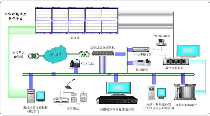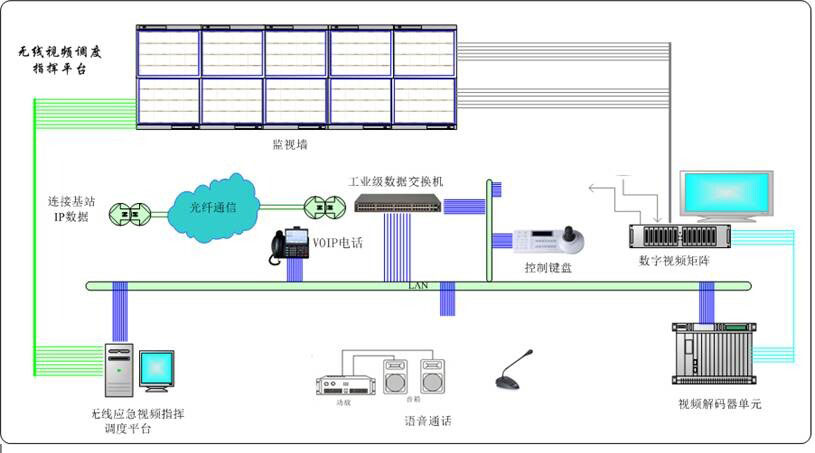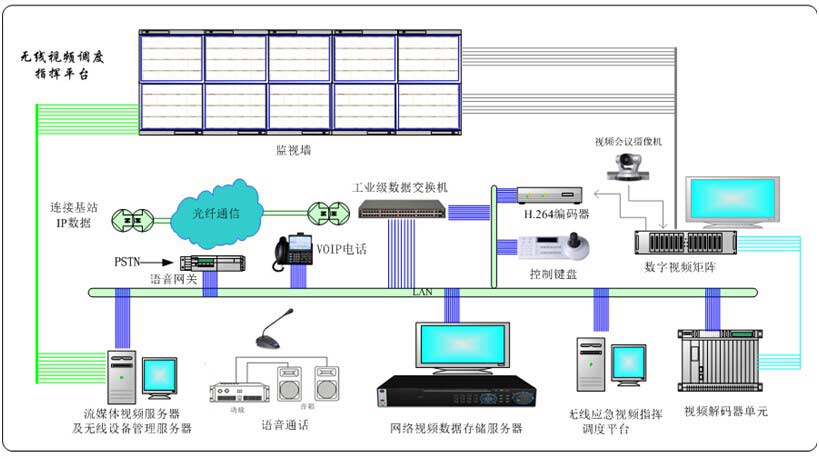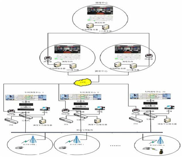 (2) 无线应急视频指挥调度平台:调度员的操作平台,是实现调度功能的窗口。调度台可以是笔记本、台式机,配置调度管理软件,提供图形化的操作界面。一台调度机可以驱动多个调度台,只要所有调度台处于一个网络内,并经过授权,都可以进行业务调度。