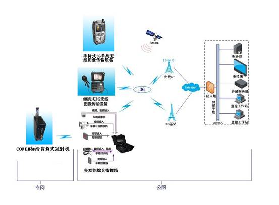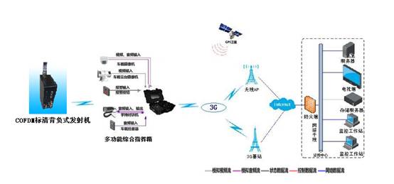 1.车载监控系统:由多功能综合指挥箱、COFDM手持式无线图像传输设备、车载摄像头、车载云台等组成。车载云台监控车外情况,车载摄像头监控车内情况,在车辆不方便到达的地方可以使用COFDM背负式标清无线图像传输设备监控拍摄,统一由多功能综合指挥箱接收并通过4G网络传输到指挥中心。