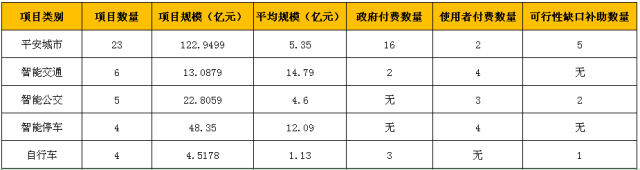 按项目类别来分,平安城市项目共有23个,智能交通项目6个,智能公交项目5个,智能停车项目4个,自行车项目4个。具体情况如下表: