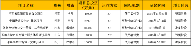 智能公交5个项目主要分布在河南、江苏、山东、四川4个省,总投资额22.8059亿元。运作方式全部为BOT,回报机制有使用者付费和可行性缺口补助两类,分别占总投资额30.3%、69.7%。