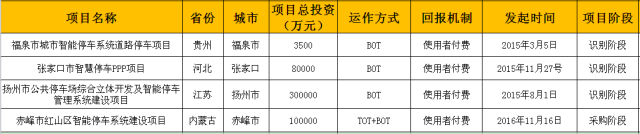 智能停车4个项目分别在贵州、河北、江苏、内蒙古4个省市,总投资额48.35亿元。其中,项目运作方式有BOT和TOT+BOT两类,分别占总投资额79.3%、20.7%;回报机制都以使用者付费方式。
