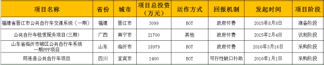 自行车4个项目分布在福建、广西、山东、四川4个省,总投资额4.5178亿元。项目运作方式有BOT和其他两类,分别占总投资额52%、48%。回报机制分为政府付费和可行性缺口补助两类,分别占总投资96.9%、3.01%。